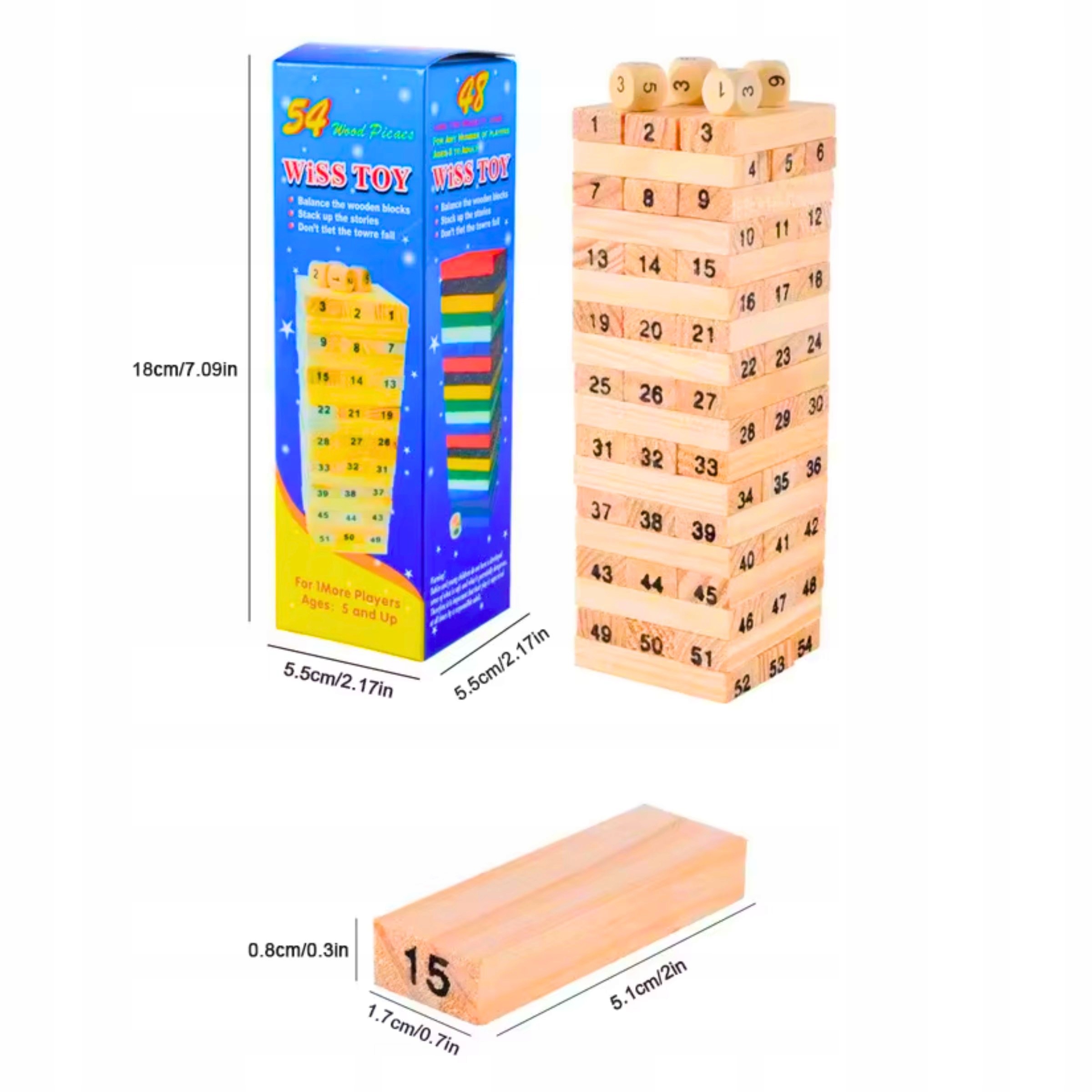 WIEŻA DREWNIANA UKŁADANKA GRA CHWIEJĄCA SIĘ Z KLOCKÓW + KOSTKI ZESTAW 54