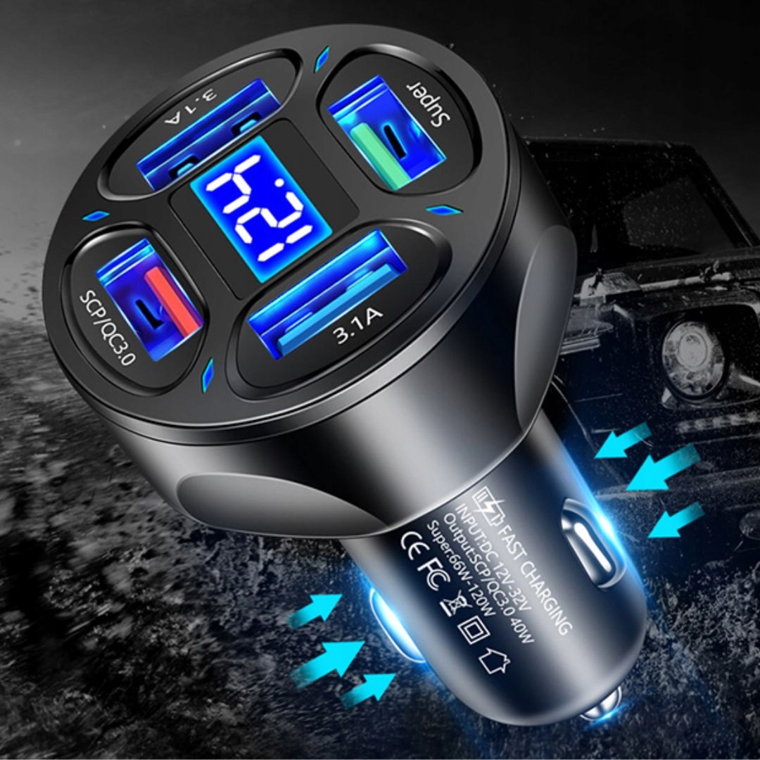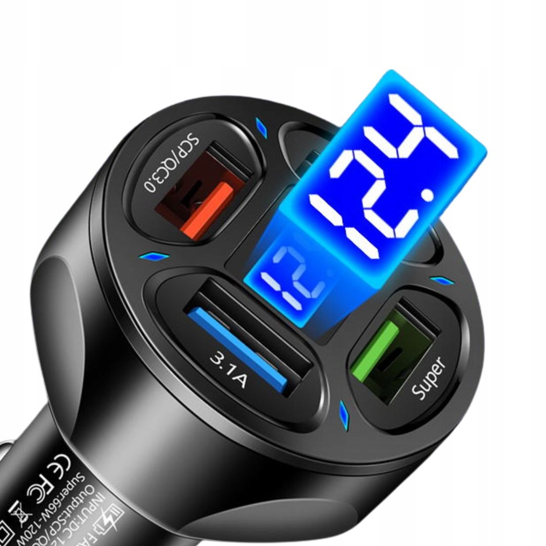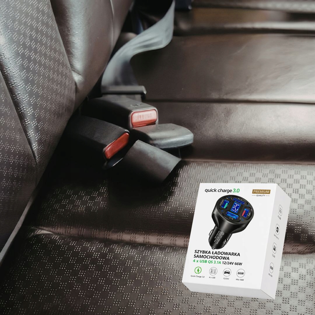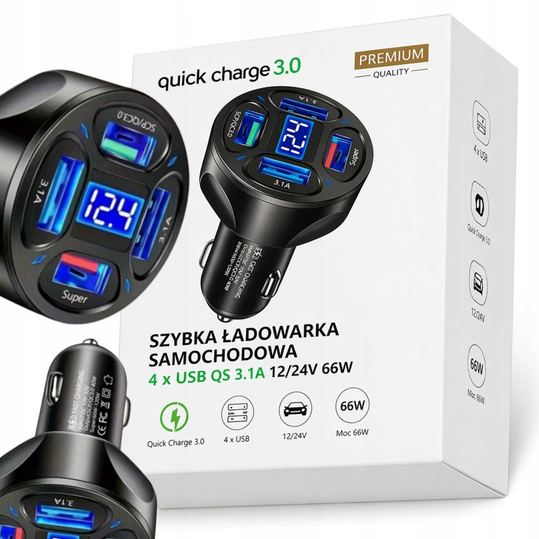 SZYBKA ŁADOWARKA SAMOCHODOWA QS 3.1A 12/24V 66W WYŚWIETLACZ NAPIĘCIA USB 4x