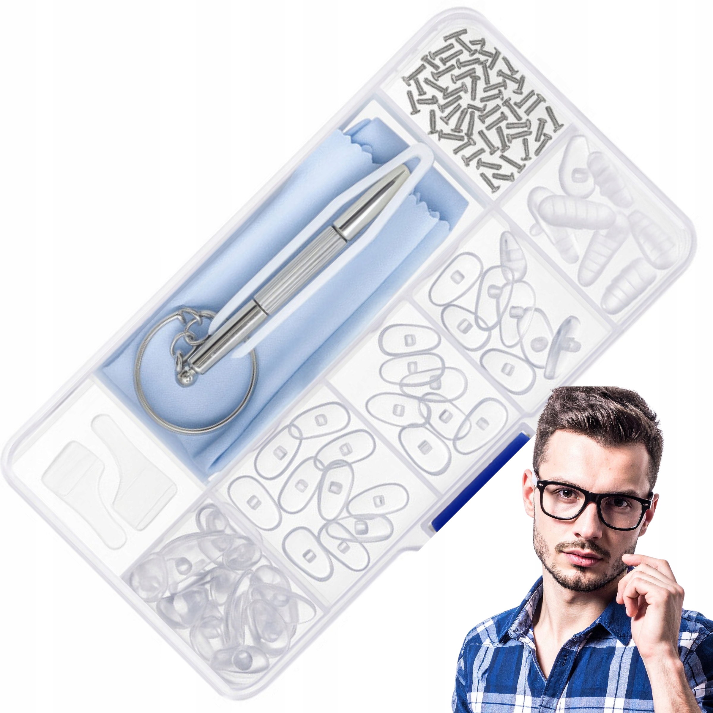 Zestaw nadaje się do większości okularów korekcyjnych, przeciwsłonecznych i sportowych. Wszystkie elementy dopasowują się do różnych typów ramek.